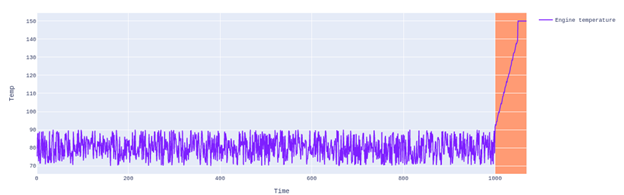 To illustrate the concept of anomaly: a car engine’s temperature must be below 90 Centigrade, otherwise it will overheat and break down. The engine’s refrigeration system keeps the temperature in the safe range; if it fails, you could notice really high temperature values. Mathematically, you’d have values under 90 for a long period of time, then the values suddenly peak to150 until your engine collapses. Visually, this is what I mean: