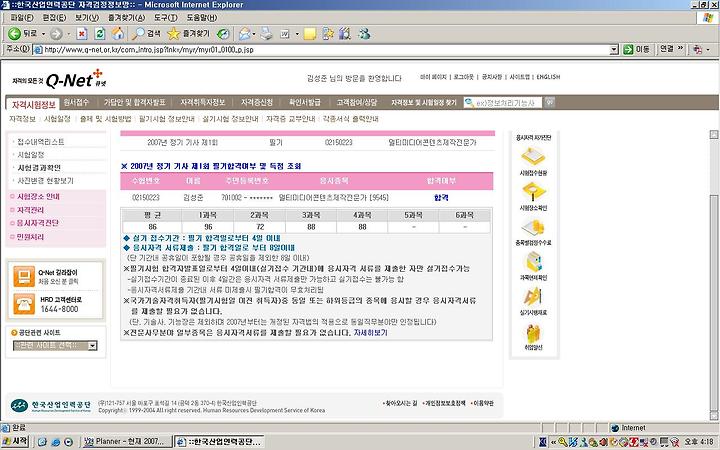 멀티미디어콘텐츠제작전문가 필기시험 득점 성적표