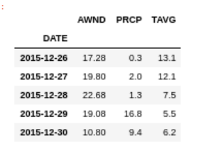각 열은 매일 샘플링되는 현상을 설명하는 변수를 나타냅니다. AWND는 시간당 킬로미터 단위의 평균 풍속, 밀리미터 단위의 평균 강수량에 해당하는 PRCP, 섭씨로 측정 된 평균 온도 인 TAVG에 해당합니다.